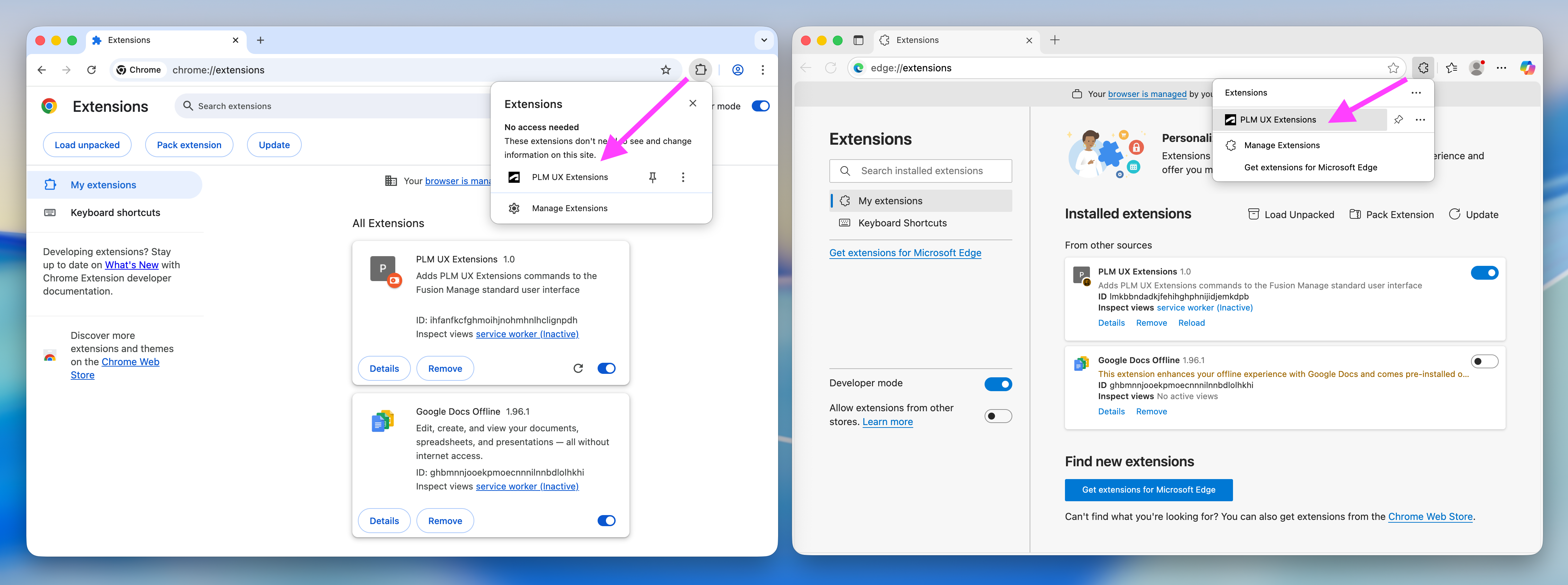 Ensure that the URL of your PLM UX Extensions server is listed in here. Note that while you can list multiple PLM UX Extensions servers in here, only one can be active. The active server is selected in the options dialog of the Chrome Extension as described in a later step. To install this package as next step, open the Extensions control of your browser by opening the address chrome://extensions either in Google Chrome or Microsoft Edge:
